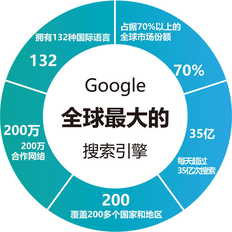 谷歌在全球占有70%的搜索市场份额,在全球200多个国家和地区有谷歌站点。在全球前50大搜索引擎网站中,谷歌有43个站点入榜,在绝大多数的国家中,谷歌都是当地的第一搜索引擎。