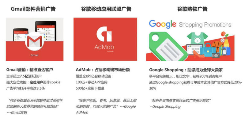 谷歌搜索广告三大优势:接触更多的使用者(覆盖88%的网民)、精准锁定目标客户(谷歌定位技术)、更高的投资回报率(只为潜在客户付费)